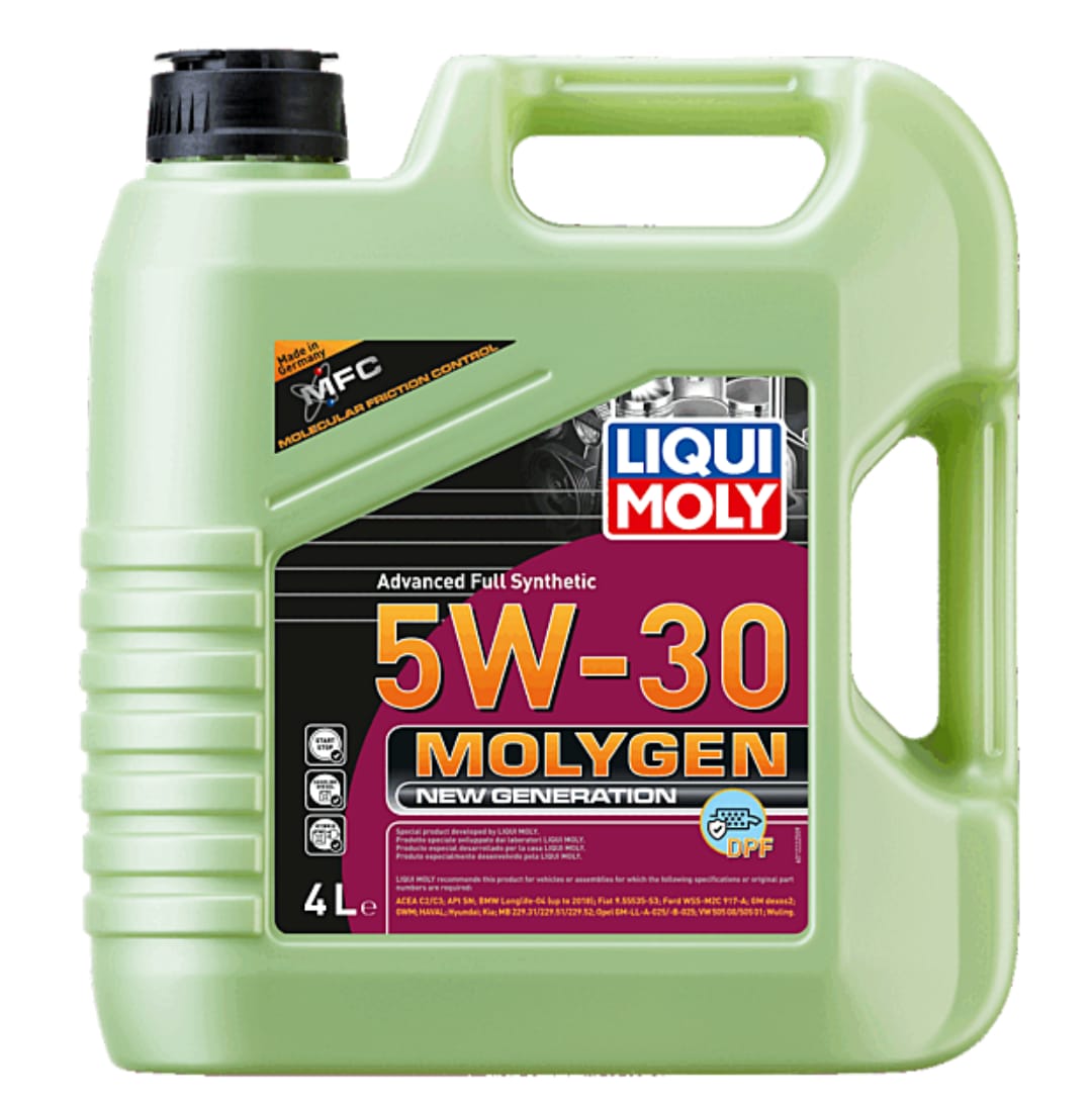 Aceite de motor sintético Liqui Moly Molygen 5W-30 DPF 4L, formulado con tecnología antifricción Molygen para máxima protección y rendimiento. Reduce el desgaste, mejora la eficiencia del motor y prolonga la vida útil del filtro de partículas diésel (DPF), ideal para motores modernos diésel y common rail.