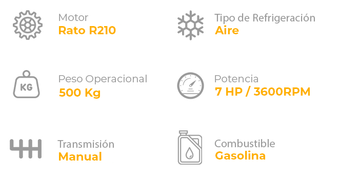 Este modelo cuenta con una capacidad de carga de hasta 500 kg, lo que lo hace ideal para mover tierra, arena, escombros, leña y materiales de construcción de forma rápida y sin esfuerzo. Está equipado con un motor a gasolina Rato R210, refrigerado por aire, que entrega una potencia nominal de 5,2 kW (7 HP) a 3.600 RPM, asegurando un funcionamiento confiable, eficiente y adecuado para jornadas continuas de trabajo.