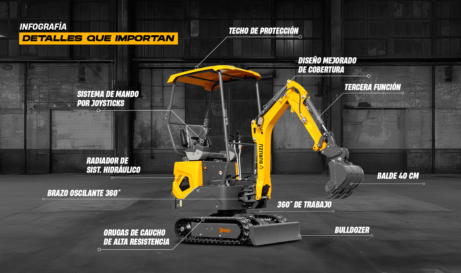Todo equipo vendido en nuestra página web www.buruzu.cl, puntos de venta, sucursales o casa matriz, cuenta con una cobertura de garantía de 6 meses. Esto significa que el representante legal, Importadora Vargas Ltda., se hará cargo de entregar a sus clientes un servicio de postventa con asistencia técnica presencial en casa matriz (Av. La Cantera 1300, Coquimbo) o asistencia técnica telefónica, según lo requiera el cliente. Para hacer efectiva la garantía, el equipo deberá ser trasladado a las instalaciones de la marca por cuenta del cliente. Se ofrecerá servicio técnico en terreno, previo acuerdo de los servicios y costos extra asociados, si la logística lo permite.Toda Mini Excavadora Buruzu cuenta además con 1 año de garantía de fábrica, que cubre la entrega de cualquier tipo de repuesto dentro de este plazo, sin mano de obra, previa revisión.