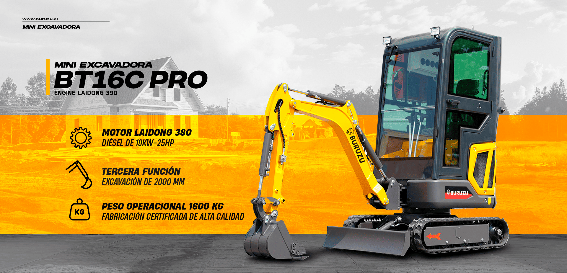 La mini excavadora BT16C PRO está diseñada para ofrecer un rendimiento eficiente en proyectos que requieren precisión en espacios reducidos. Con un peso operativo de 1600 kg y una capacidad del balde de 0,03 m³, es ideal para trabajos ligeros a medianos. Su diseño retroexcavadora permite una excavación eficiente y maniobrable.