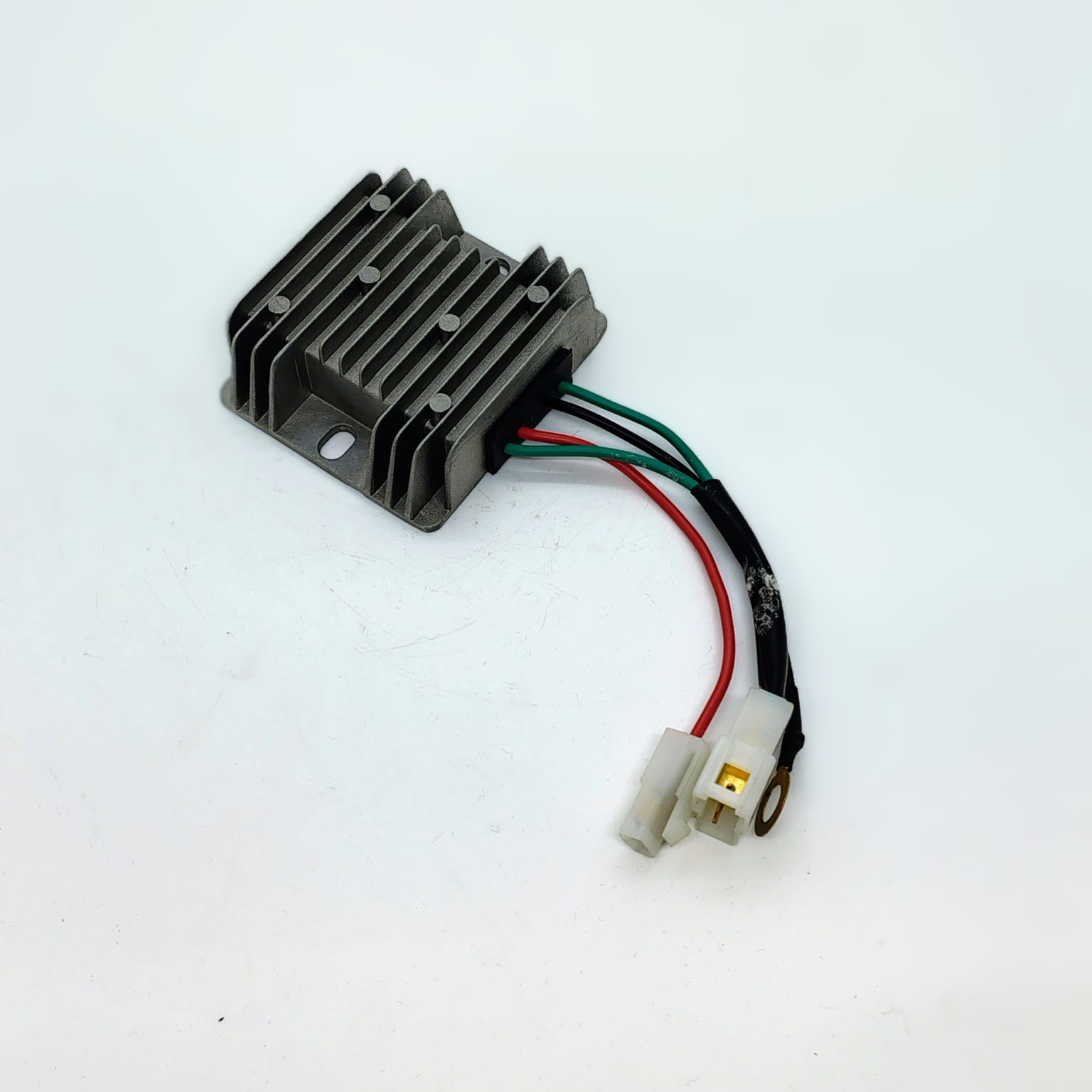 Regulador-rectificador de voltaje DC 12V, ideal para mantener la carga estable en sistemas eléctricos. Convierte corriente alterna en continua, protegiendo la batería y componentes de sobrecargas. Compacto, eficiente y confiable para pequeños motores